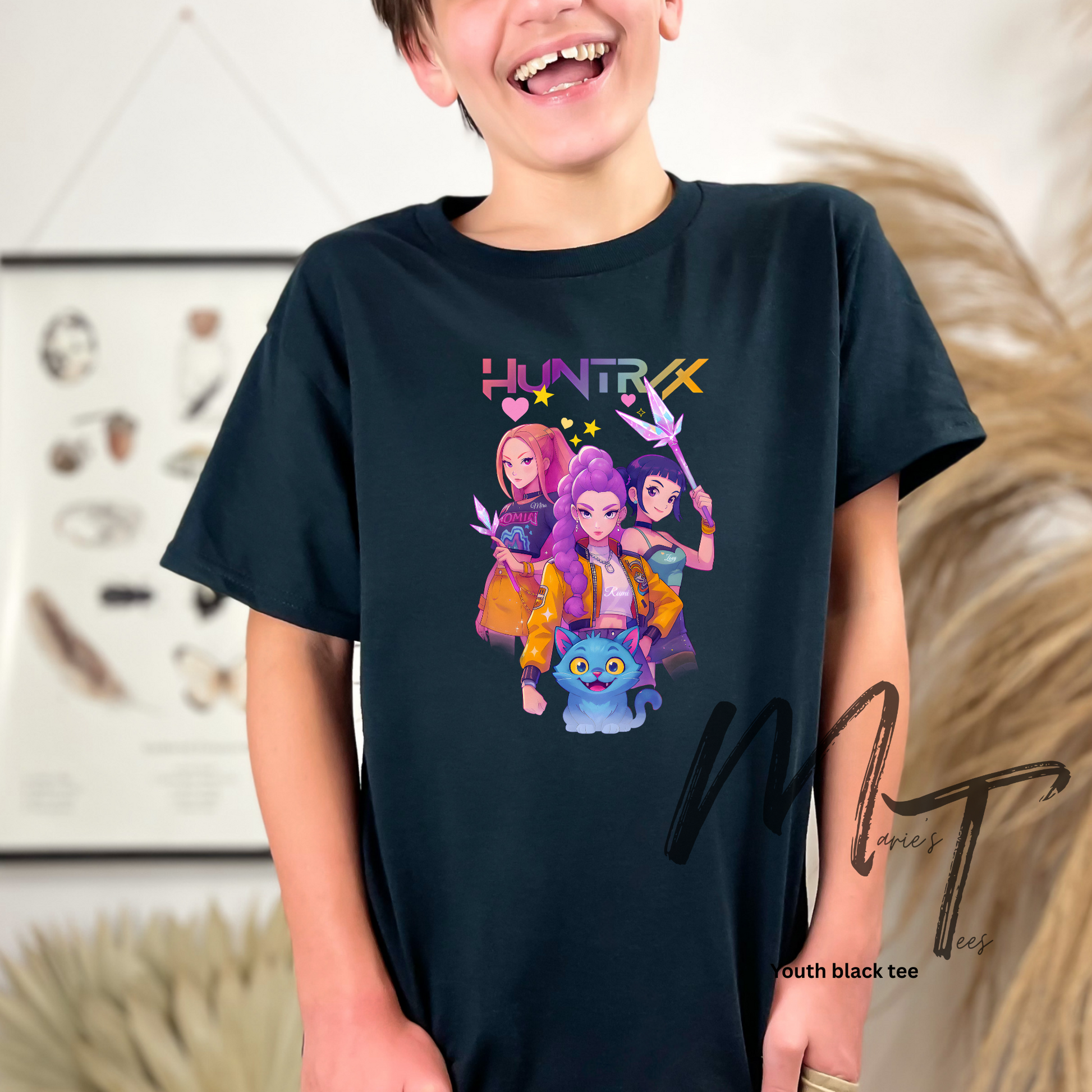 Shown on youth black tee