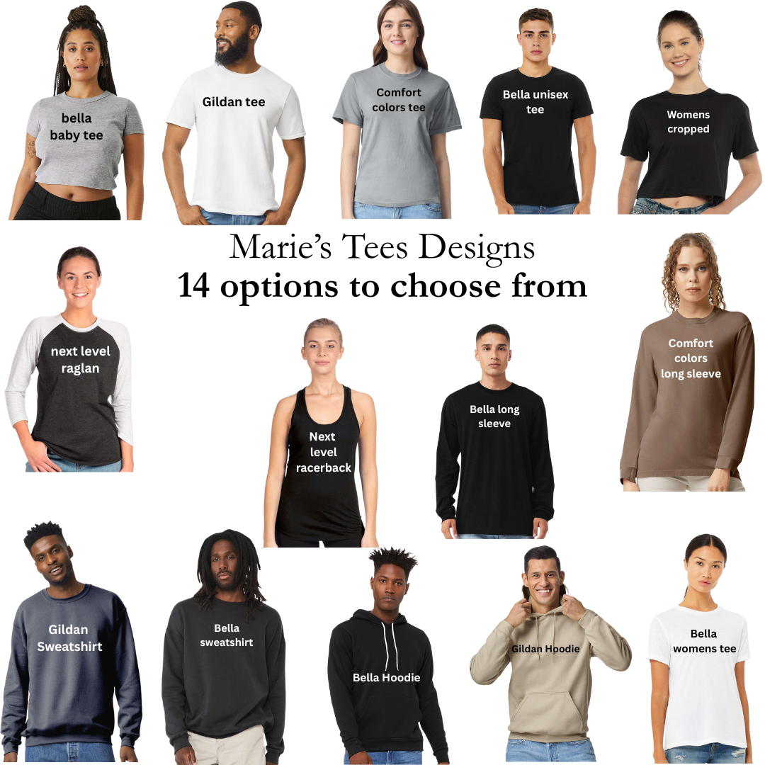 - Adult Options- Unisex Tee, Women's Racerback Tank, Unisex Long Sleeve, Unisex Sweatshirt, Unisex Hoodie, Unisex Raglan, Women's Tee